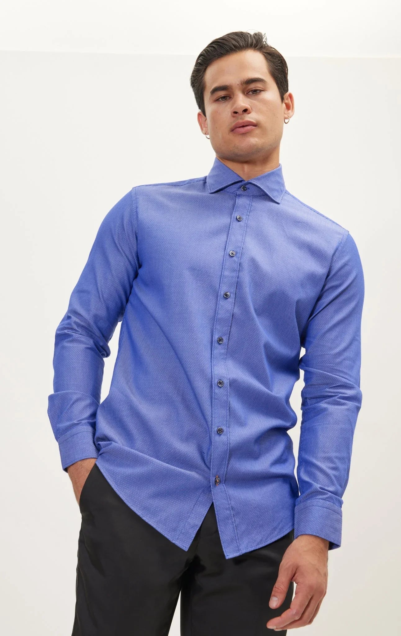 Wear this casual shirt when you're planning to go to happy hour after work - a quick roll of the cuffs reveals a classic Mr. Cool look and instantly lightens the mood. Fitted with removable collar stays to keep your collars neatly in place. Cut for a neat slim fit and detailed with hand sewn buttons....