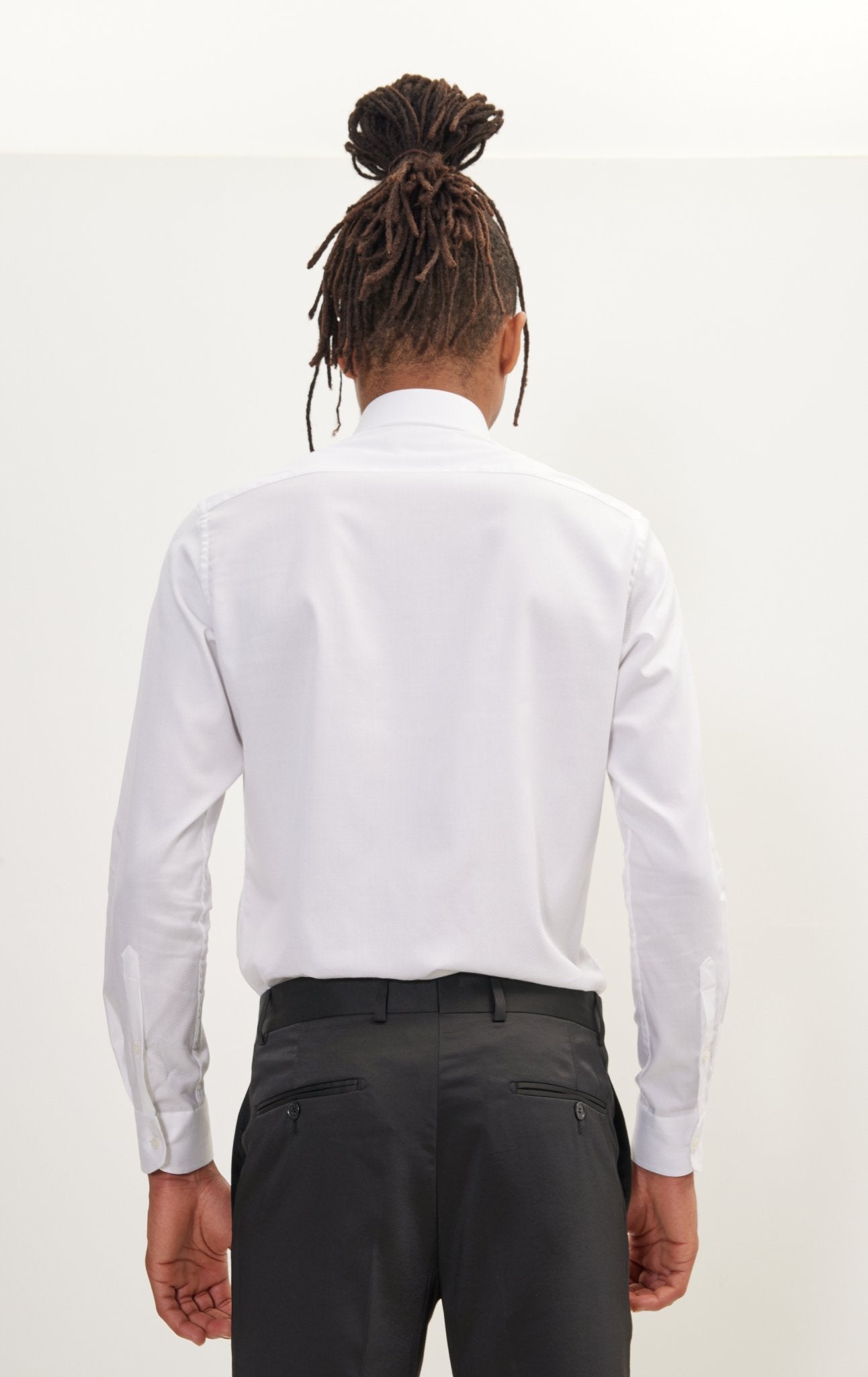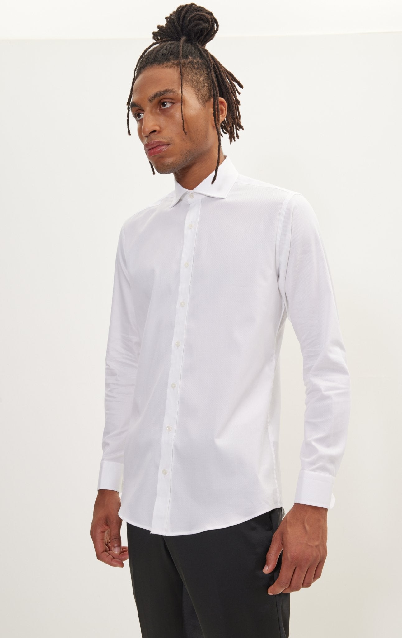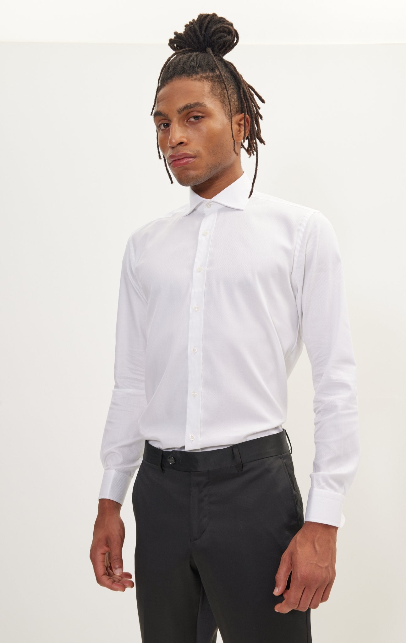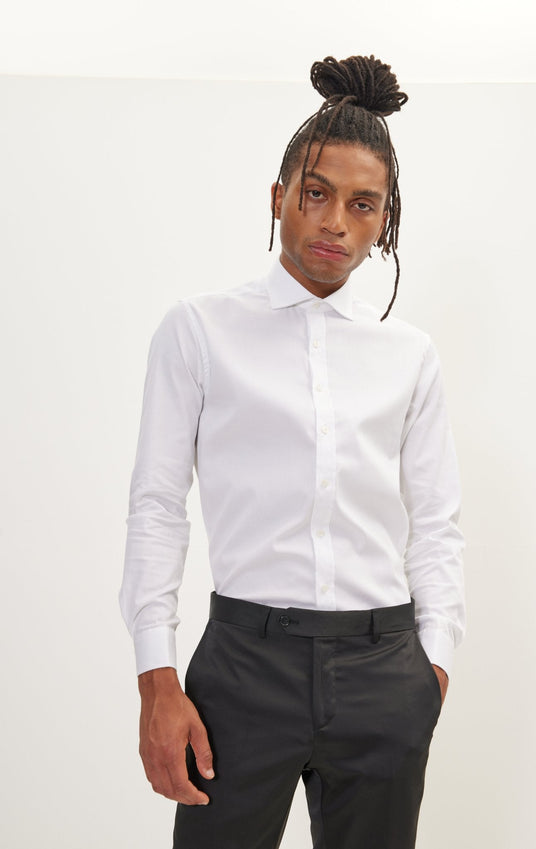 A superior twill single jersey cotton shirt with a super-smooth pinpoint weave finish. Classic tailoring at its best. Our model Brian is 6'2'' 36 Chest and he is wearing a Medium size.