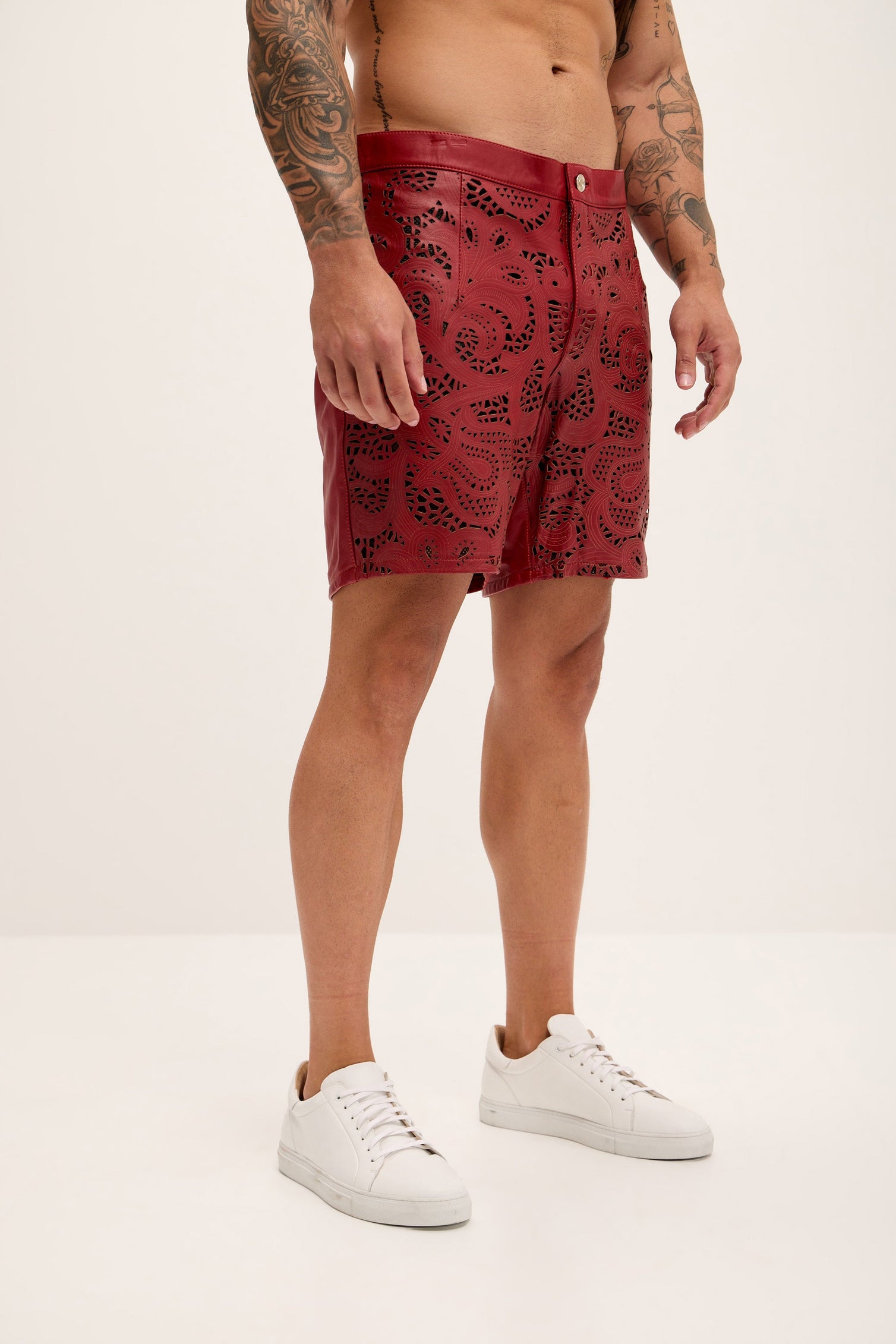 Genuine leather shorts with cut-out design in the front and solid in the back. Fully lined. Fitted construction.