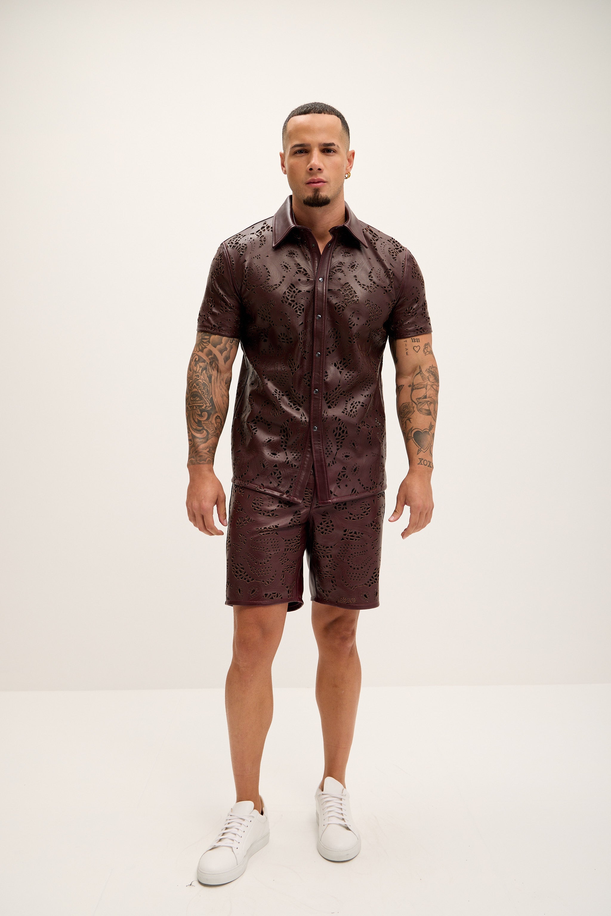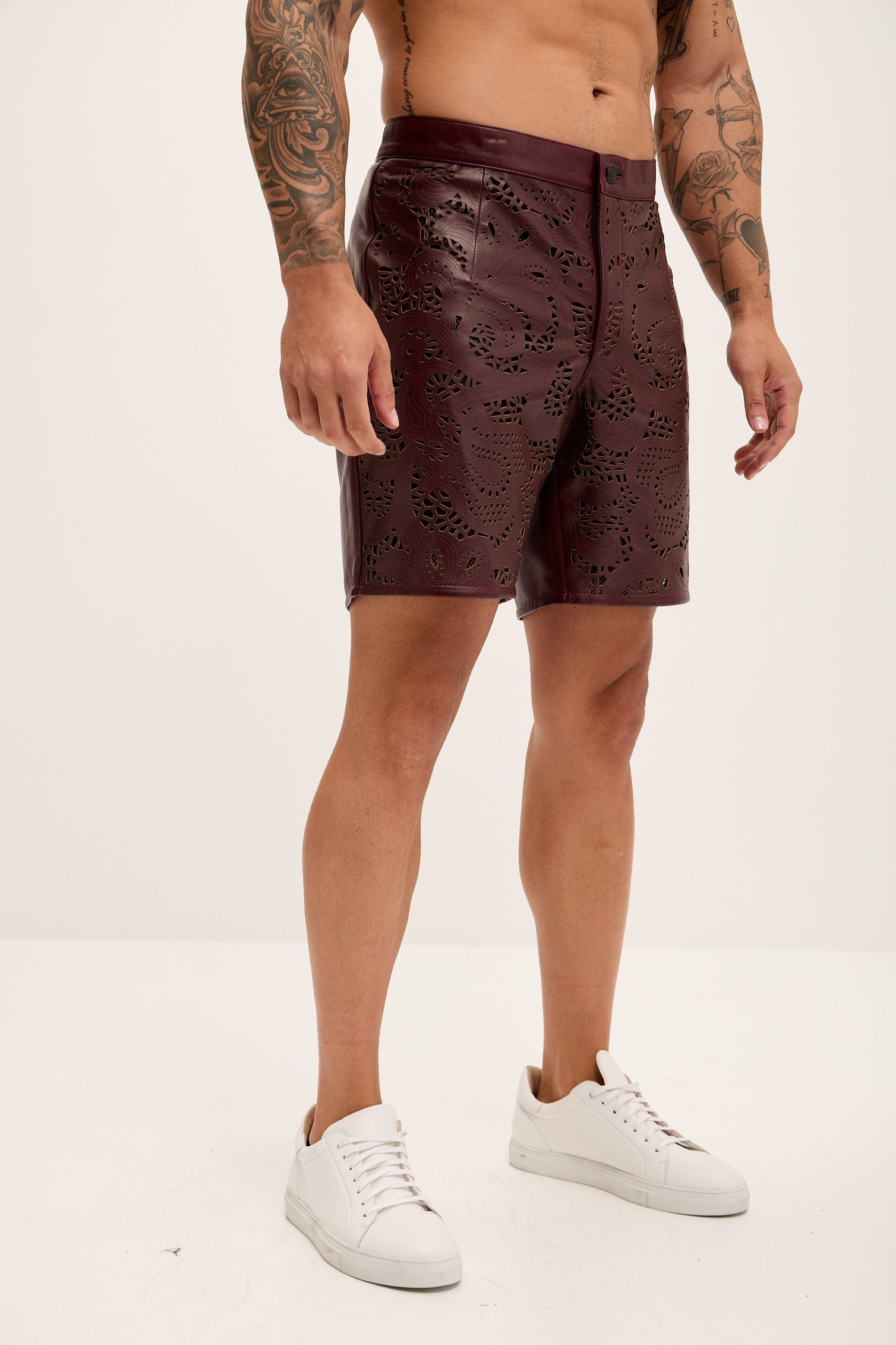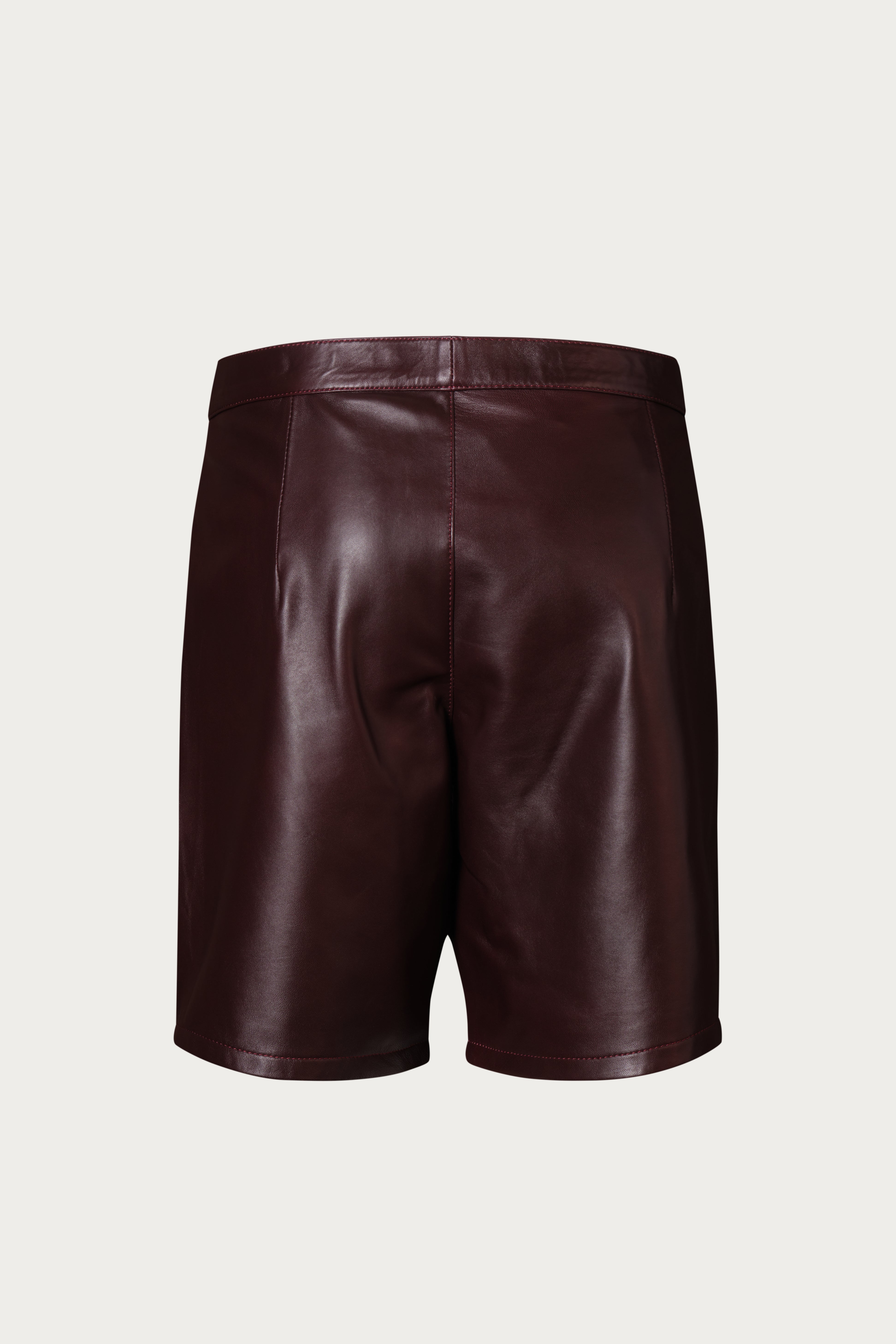 Genuine leather shorts with cut-out design in the front and solid in the back. Fully lined. Fitted construction.