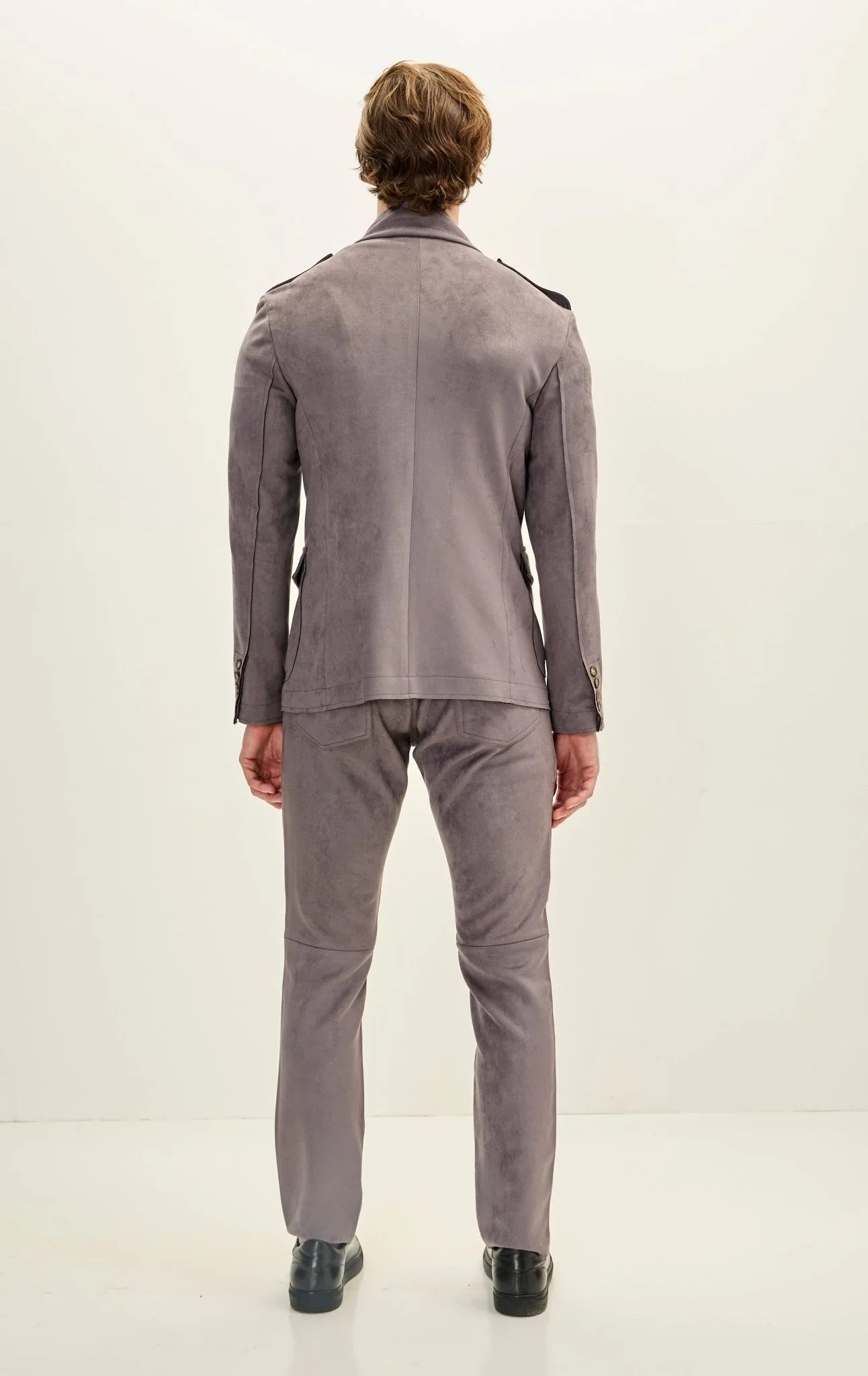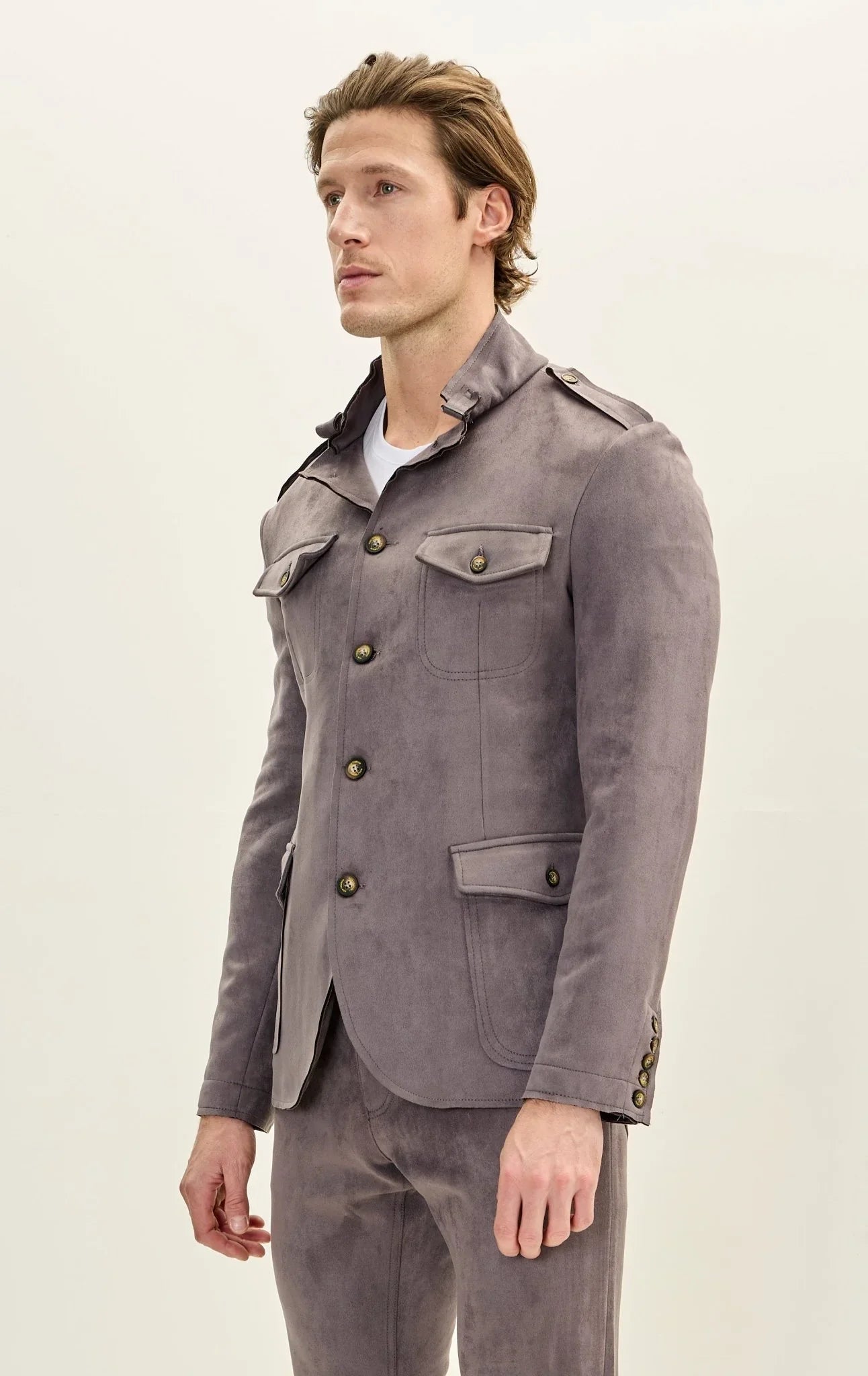 DETAILS Faux suede stand-up collar with buckle detail notch lapel when folded. 3-button closure, epaulets on the shoulder, and chest and side patch flap pockets. SIZE + FIT Tailored fit, to find your correct size use the "what's my size" button. COMPOSITION 91% Polyester 9% Elastane Made in Turkey Style...