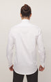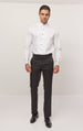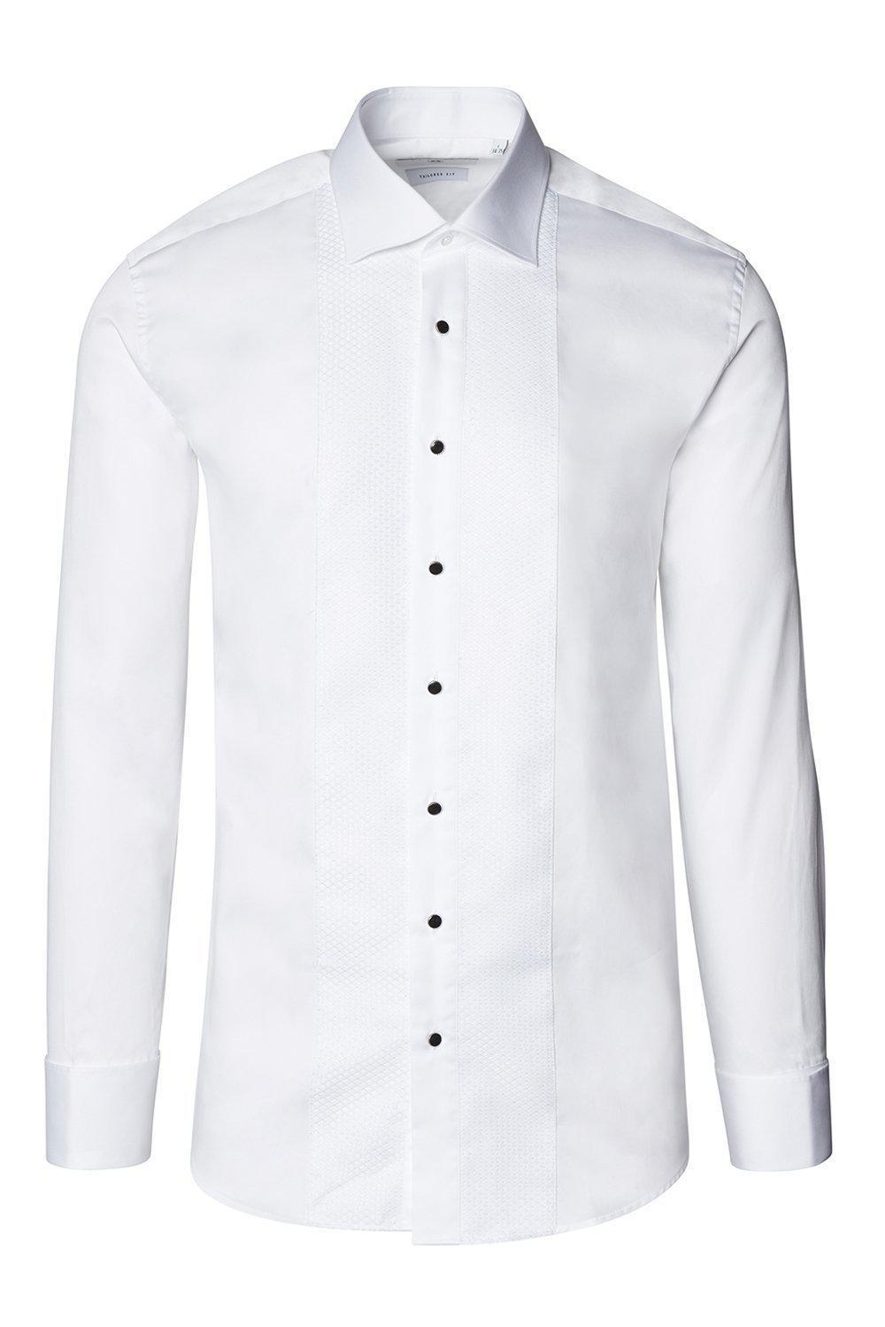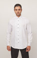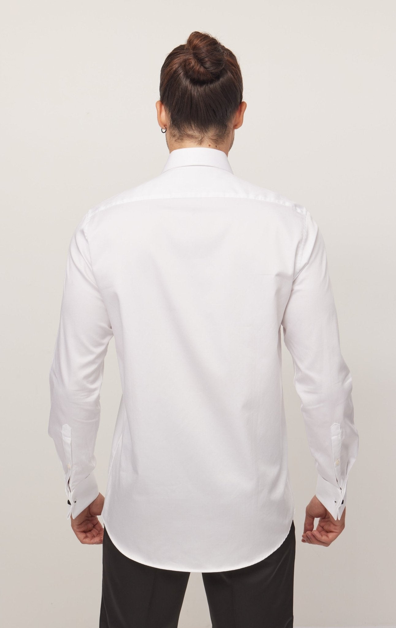 Long sleeve spread collar button-up formal shirt. Made with European pure cotton fabric, chest lurex paneled, black enamel in silver setting buttons, and French cuffs with knotted silk cufflinks.