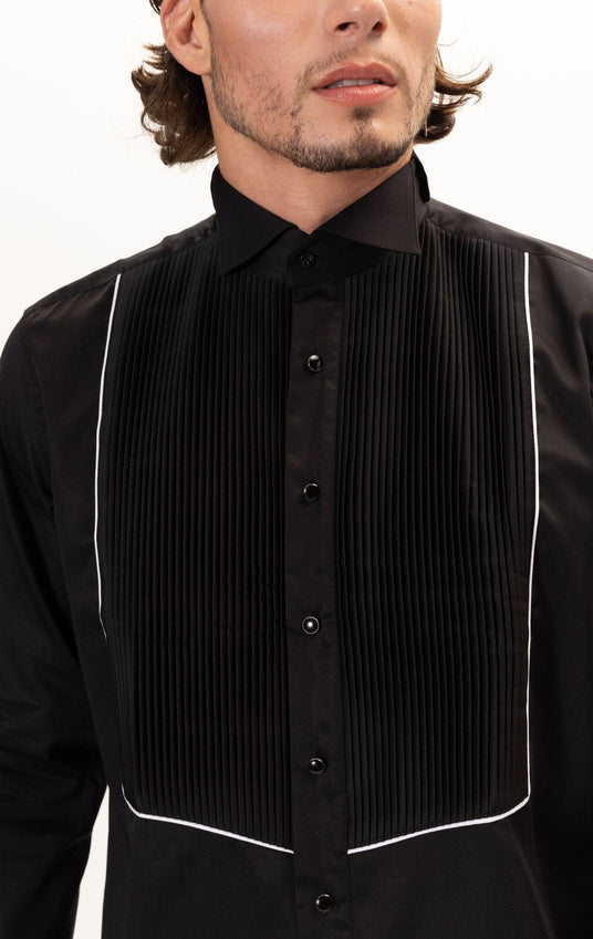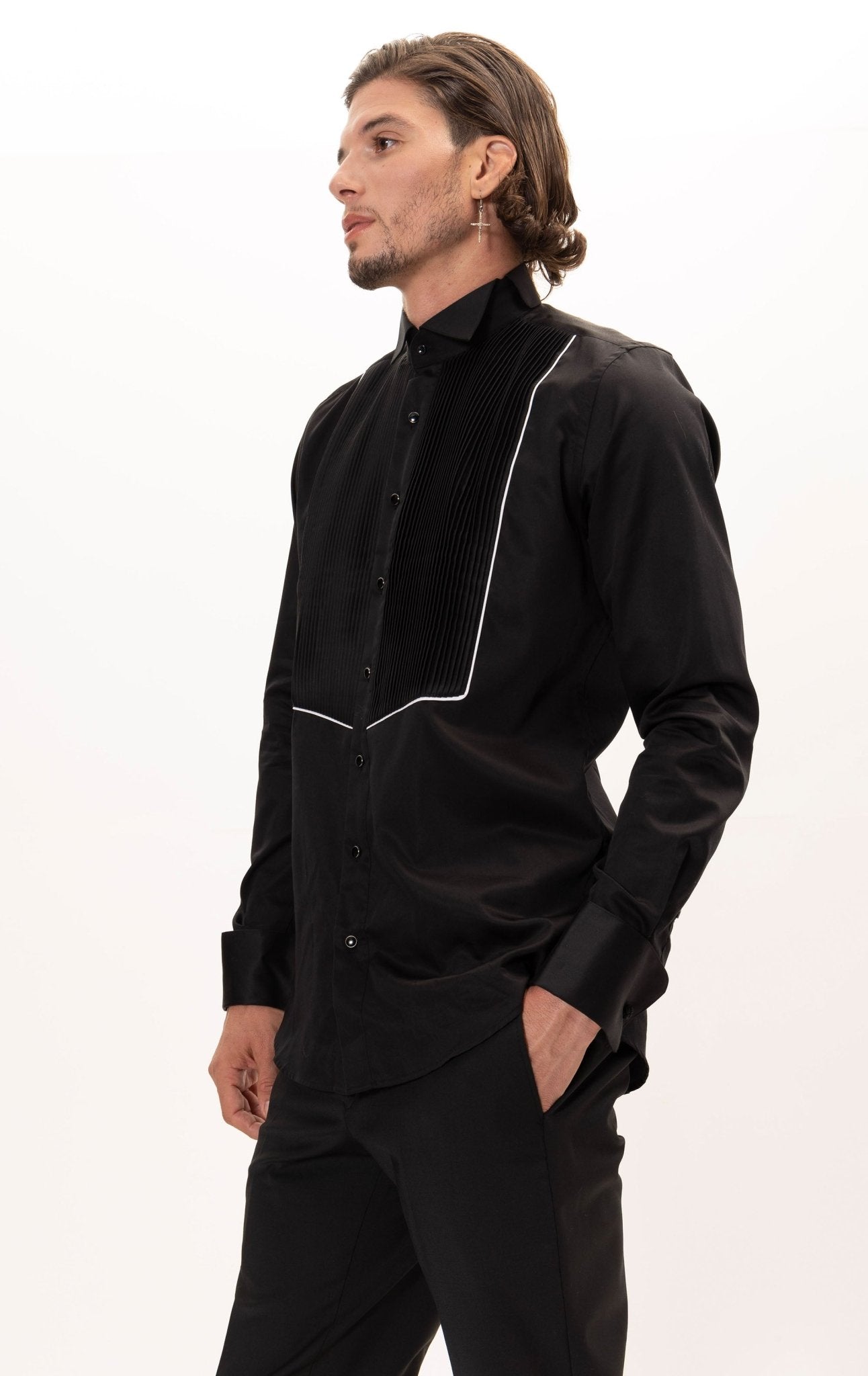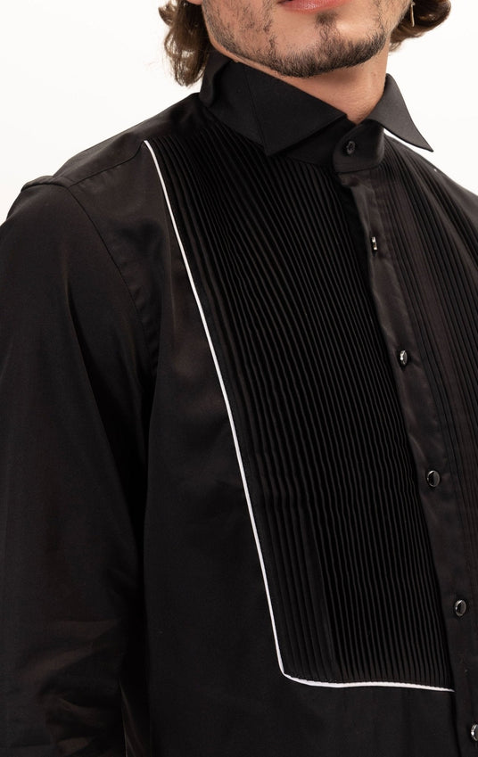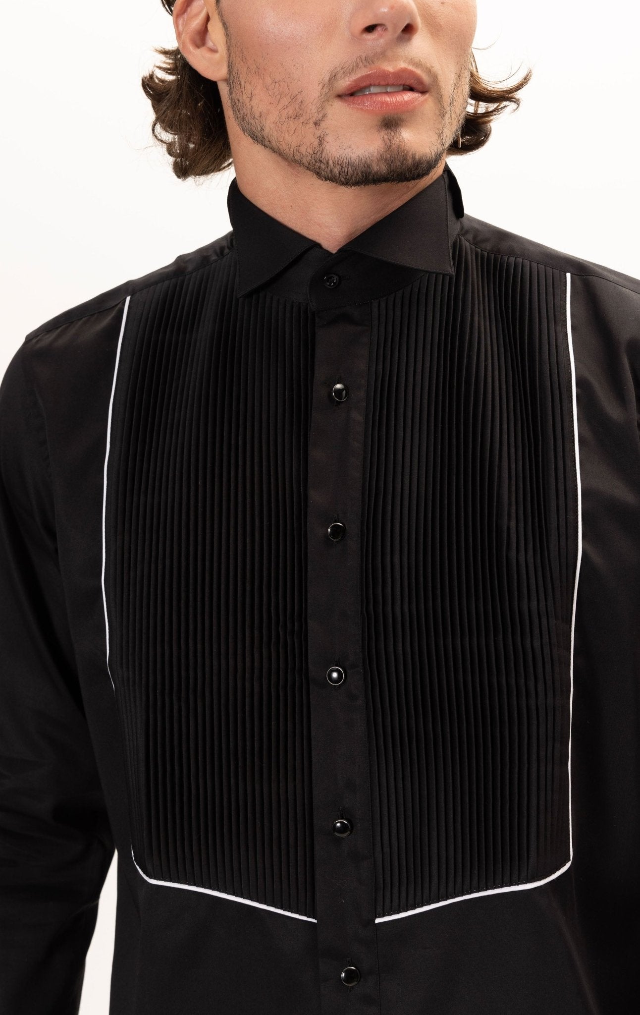 Pure Cotton Pleated Wing Tip Collar Shirt - Black White
