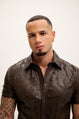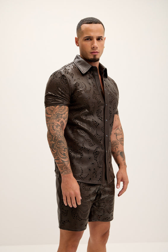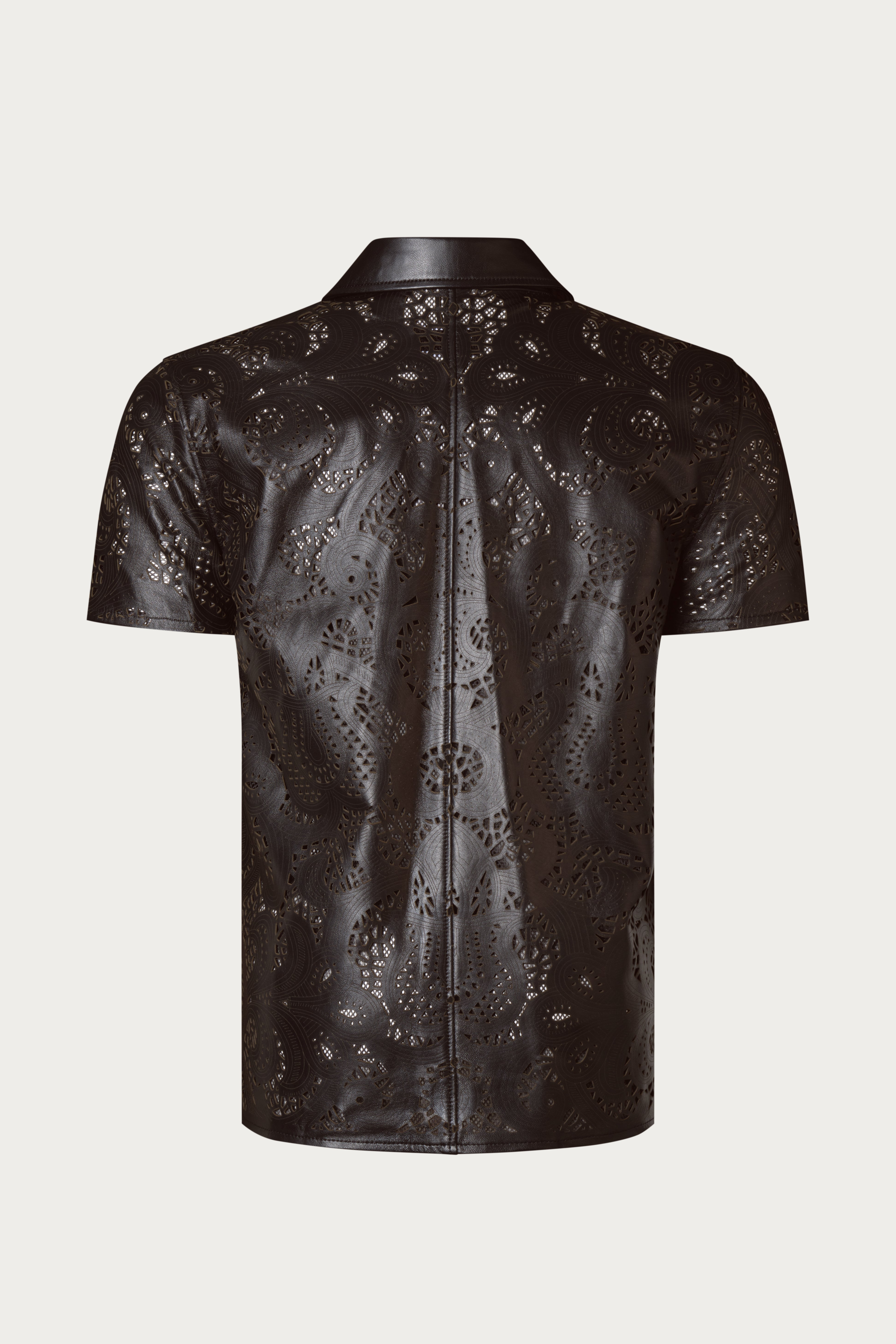 Genuine leather shirt with allover cut-out design. Fully see-through and unlined. Fitted construction. Allover stitching throughout the pointy Italian collar and the placket. Snap button closure.
