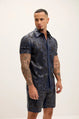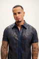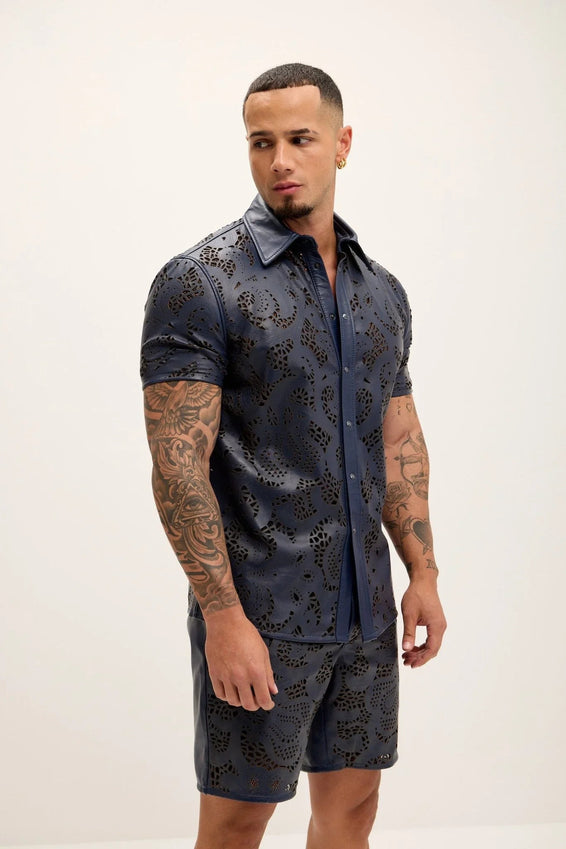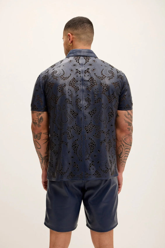 Genuine leather shirt with allover cut-out design. Fully see-through and unlined. Fitted construction. Allover stitching throughout the pointy Italian collar and the placket. Snap button closure. Matching shorts available, Style #2783. Reach out for other colors, which will be available online soon. Made in Turkey100% Genuine Premium Leather Style #4987