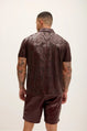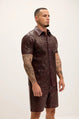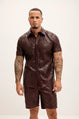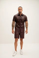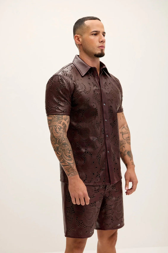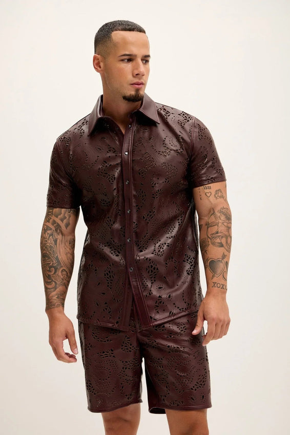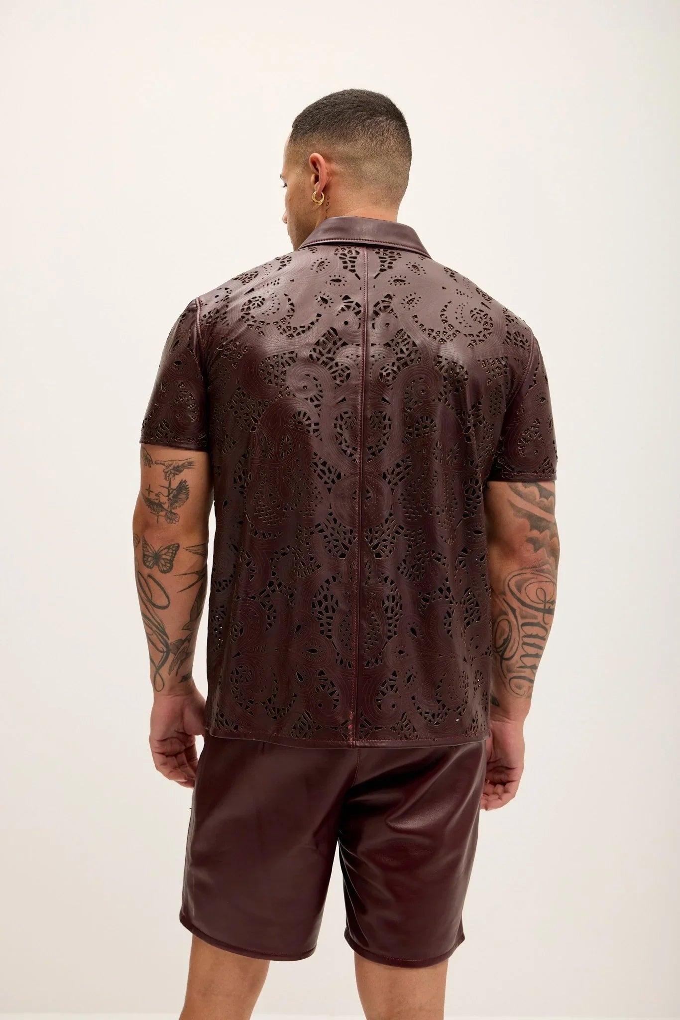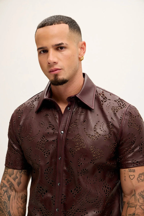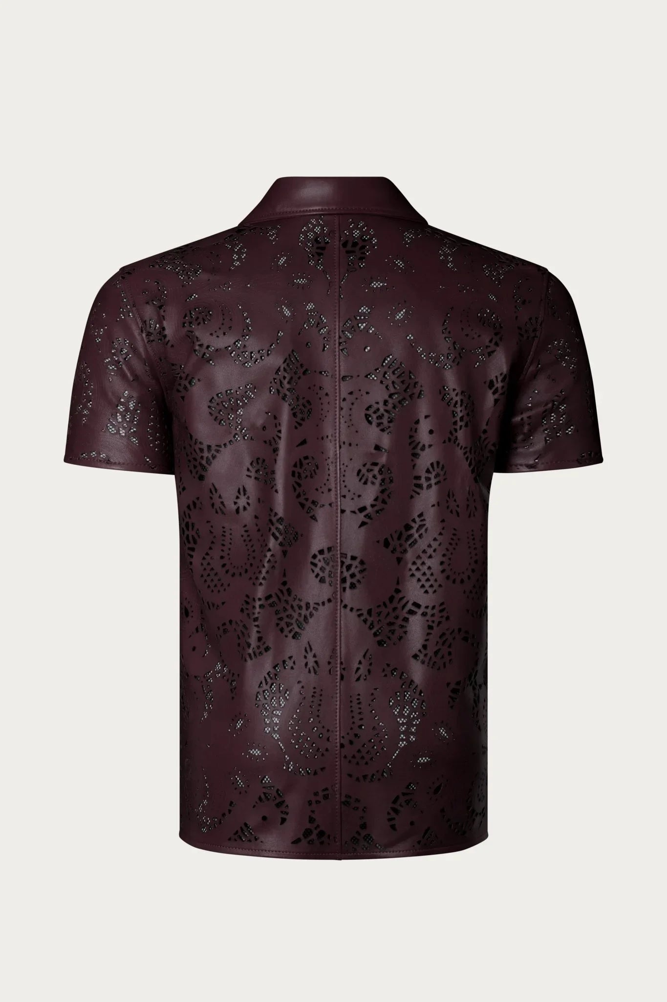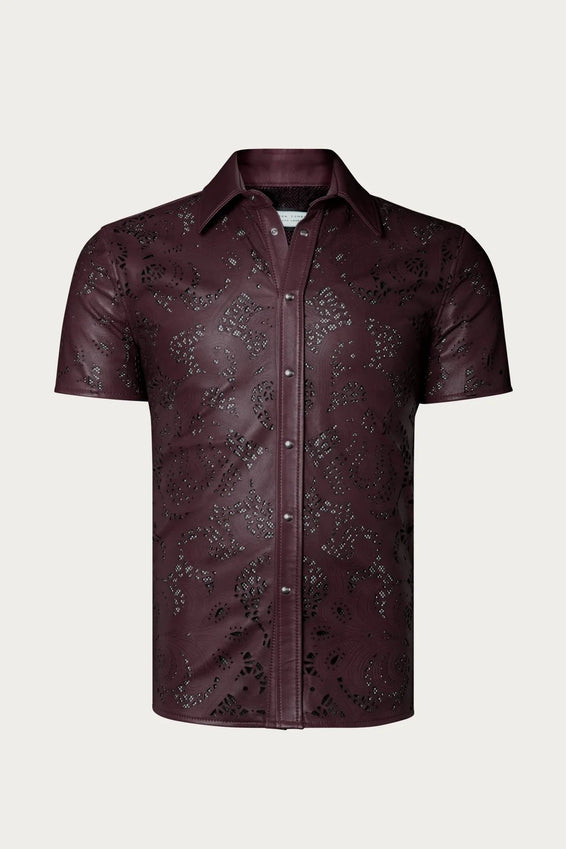 Genuine leather shirt with allover cut-out design. Fully see-through and unlined. Fitted construction. Allover stitching throughout the pointy Italian collar and the placket. Snap button closure.
