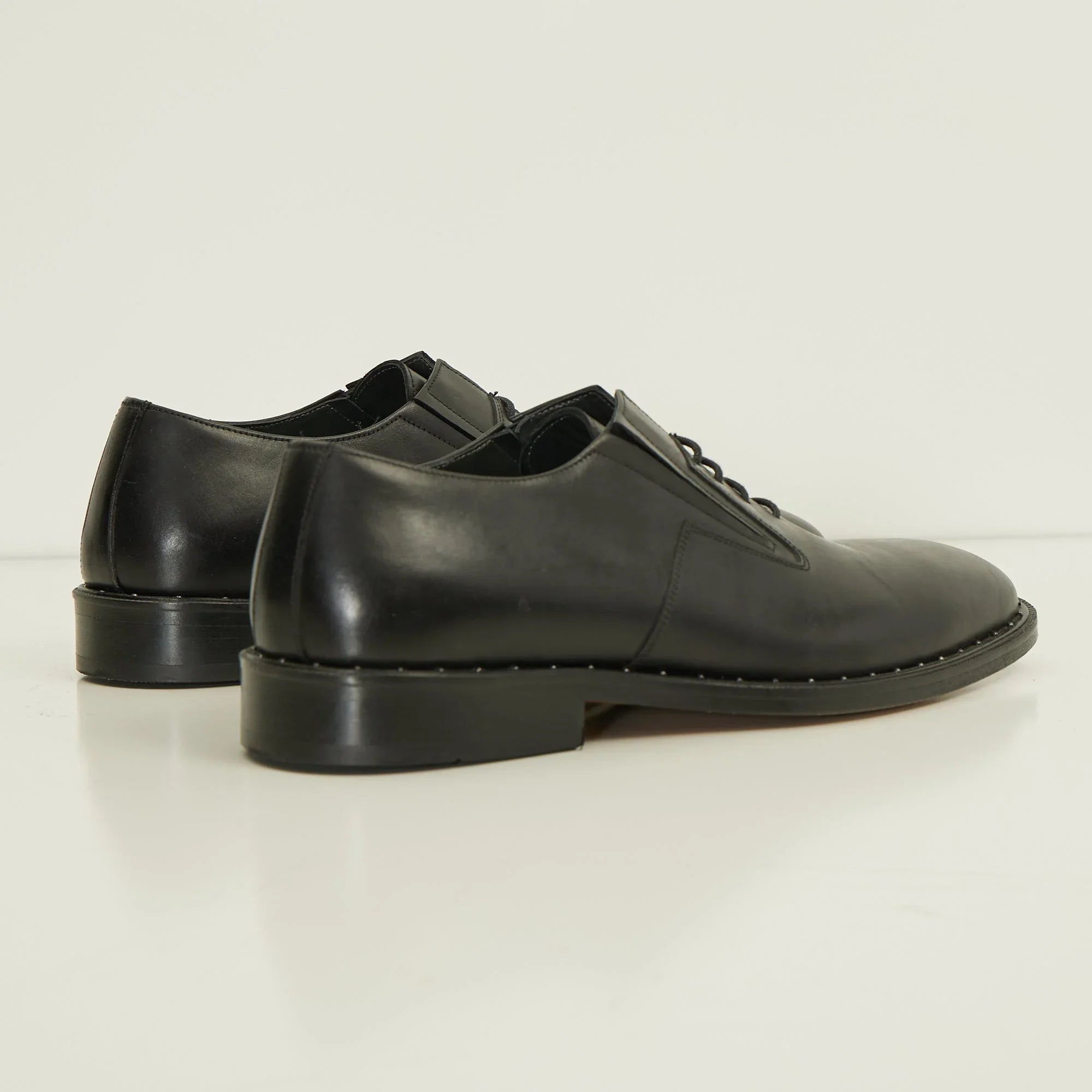 Lace plain toe oxford leather shoe. Calfskin leather upper, elastic bands on the inner facing, and studded details on the welt.
