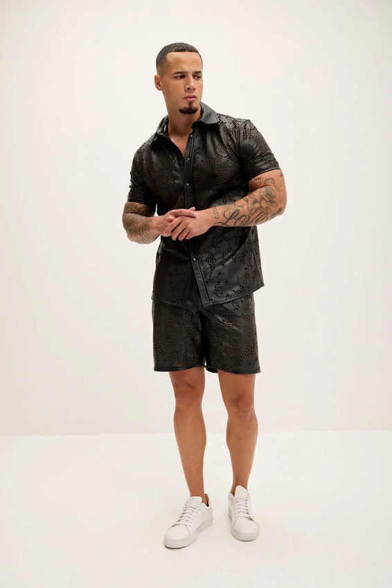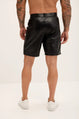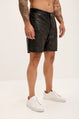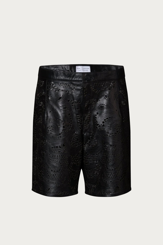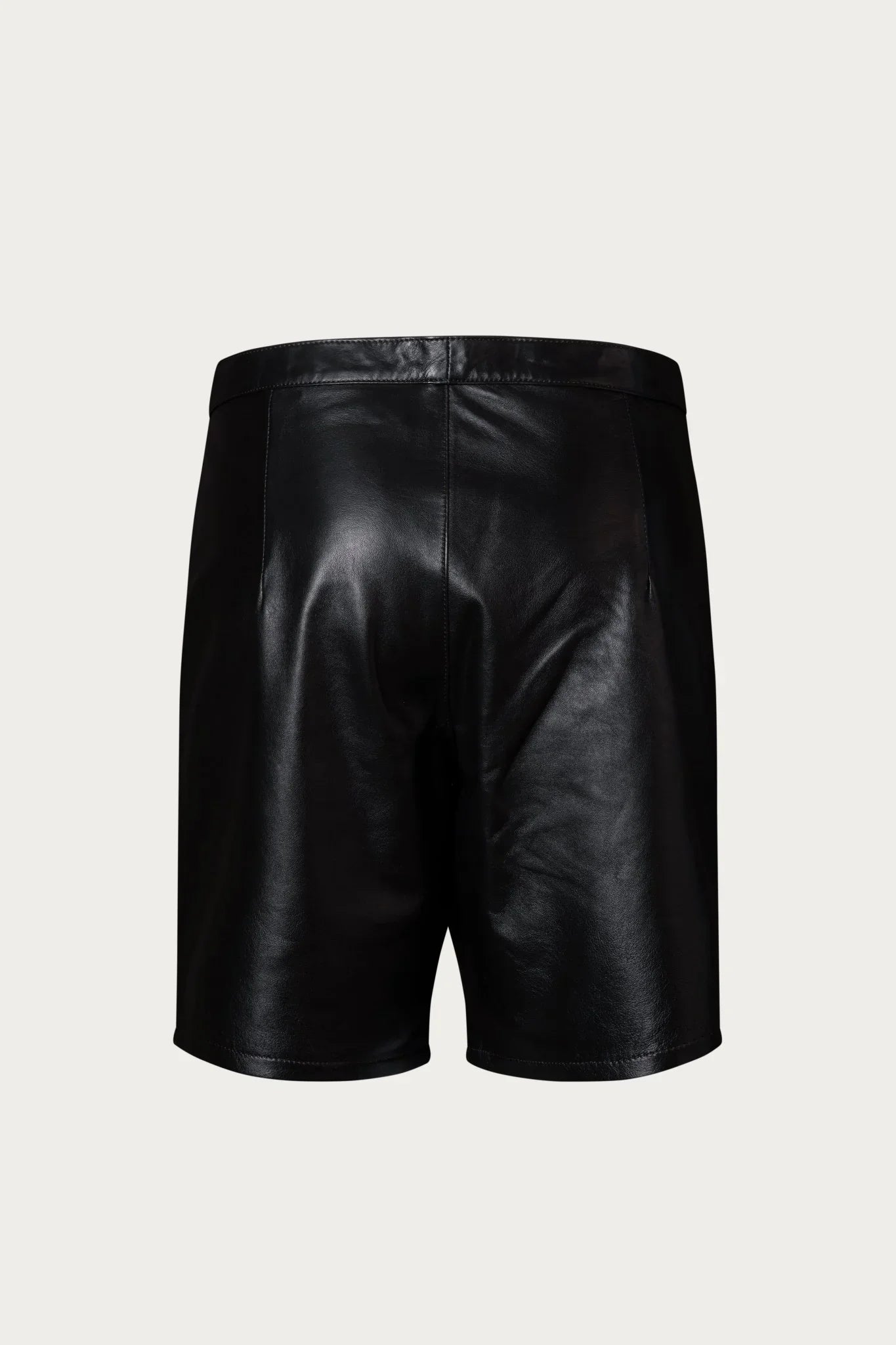 Genuine leather shorts with cut-out design in the front and solid in the back. Fully lined. Fitted construction.