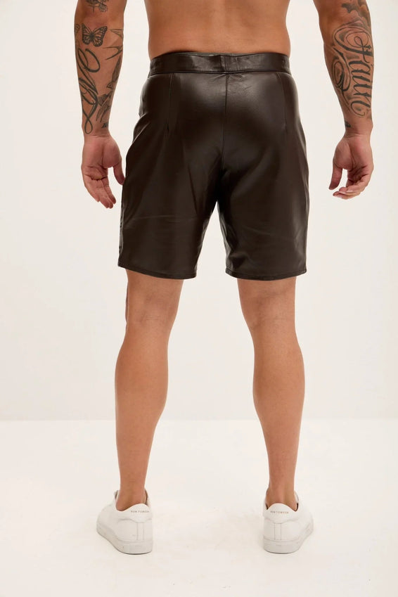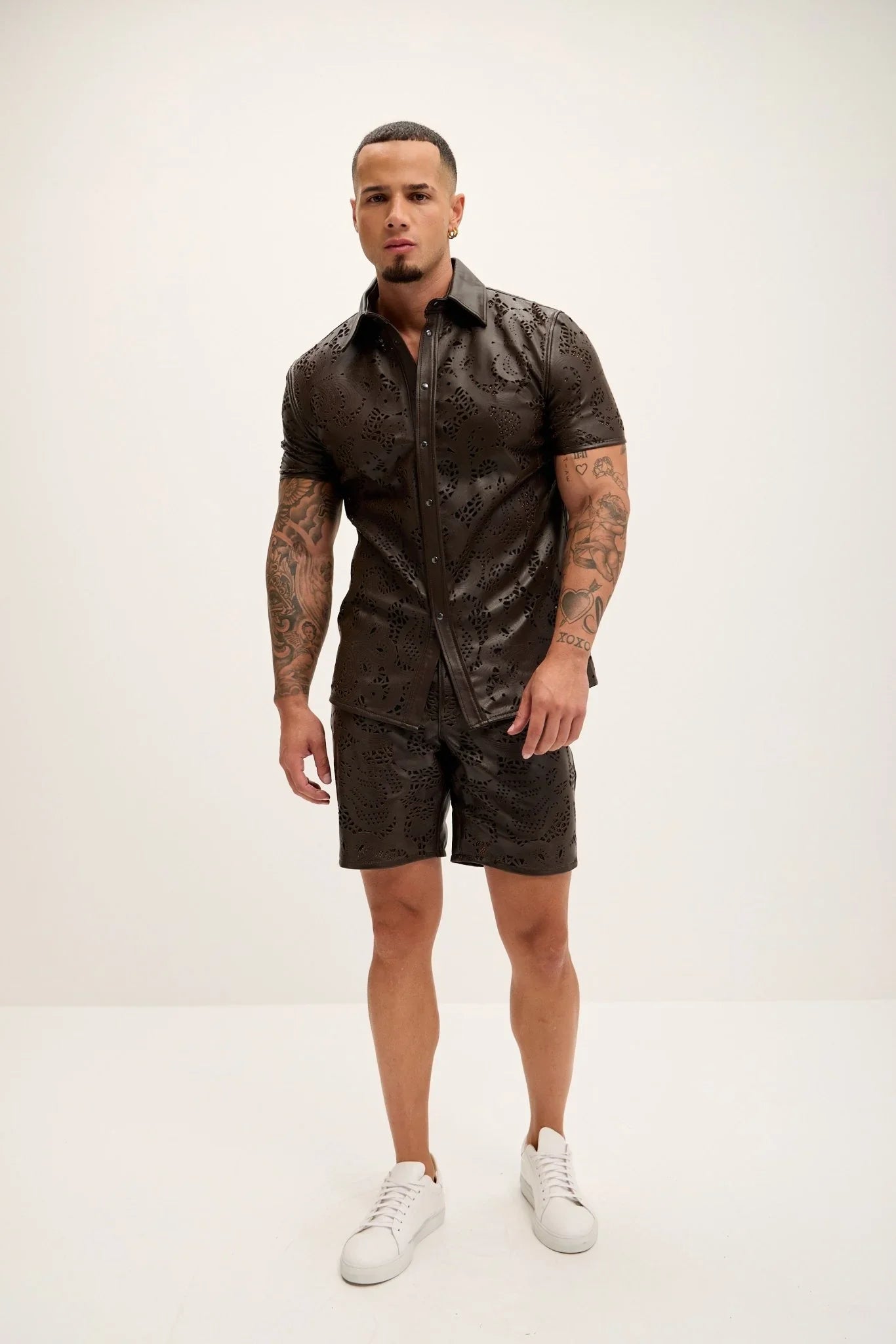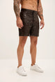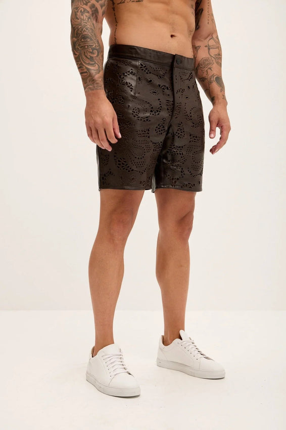 Genuine leather shorts with cut-out design in the front and solid in the back. Fully lined. Fitted construction.
