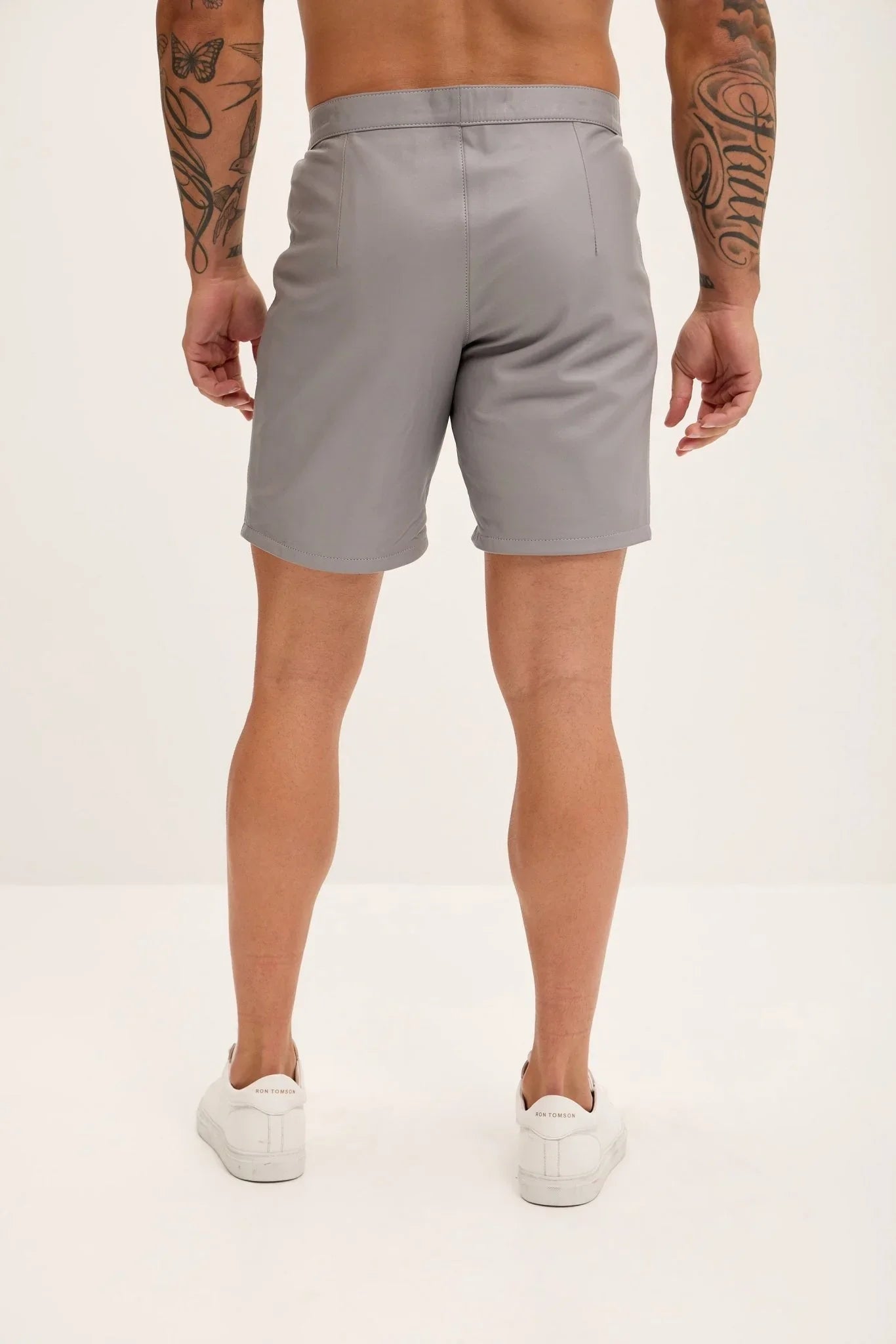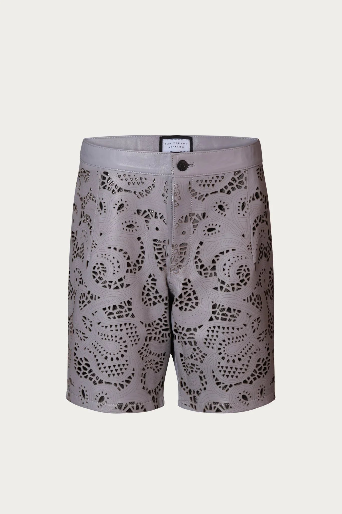 Genuine leather shorts with cut-out design in the front and solid in the back. Fully lined. Fitted construction.