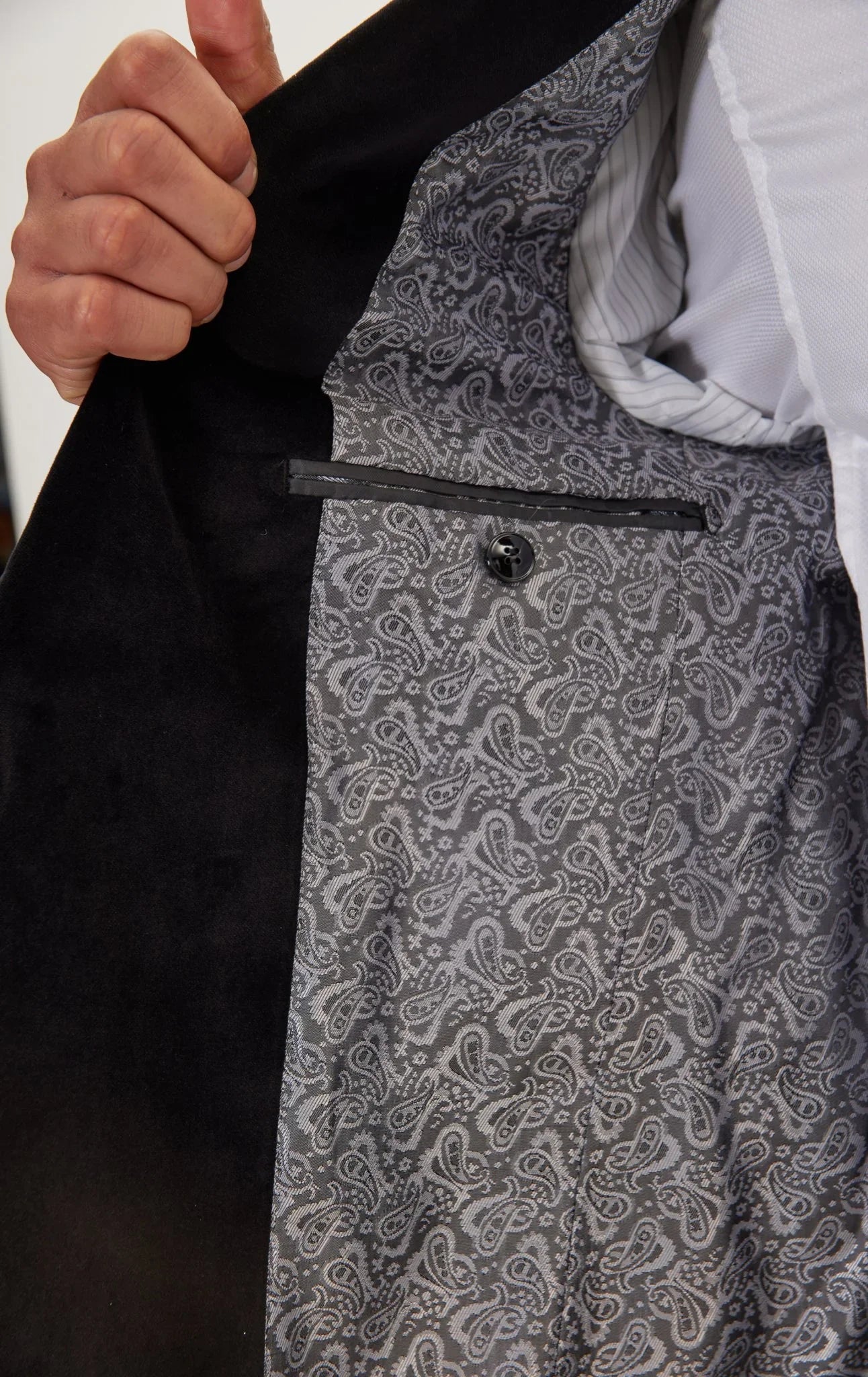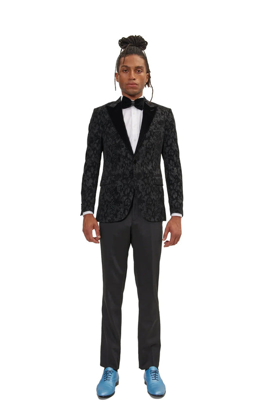 DETAILS A black tailored fitting tuxedo that features a black abstract pattern created using the flocking method. Made using high-quality materials, that will ensure that you look and feel your best. Creating a raised texture to the garment, adding depth and dimension to the tuxedo. With the peak lapel, it...