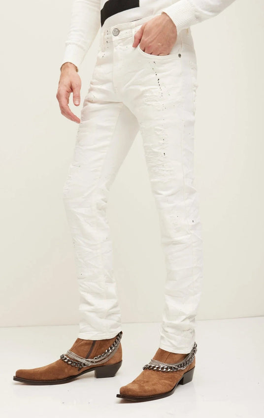 DETAILS You can never have too many classic staples. Tonal stitching compliments our classic soft cotton denim with subtle distressing and contrasting paint splatter. Featuring a five pocket design with metal hardware, a button fly, and slim tapered fit. SIZE + FITRegular fit, to find your correct size use the "what's my size" button. ...