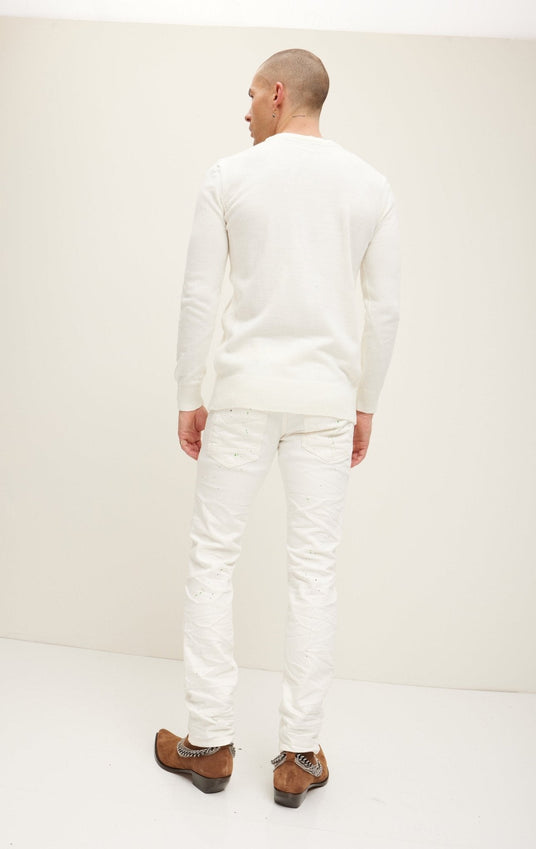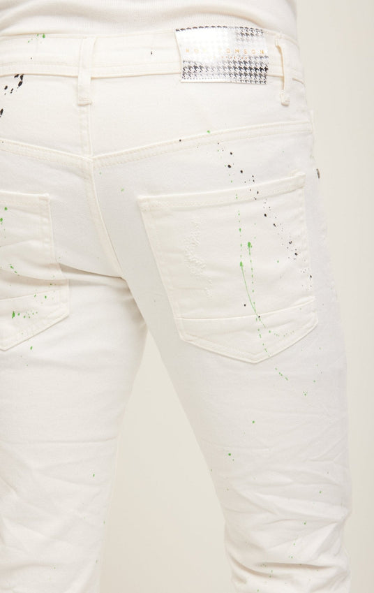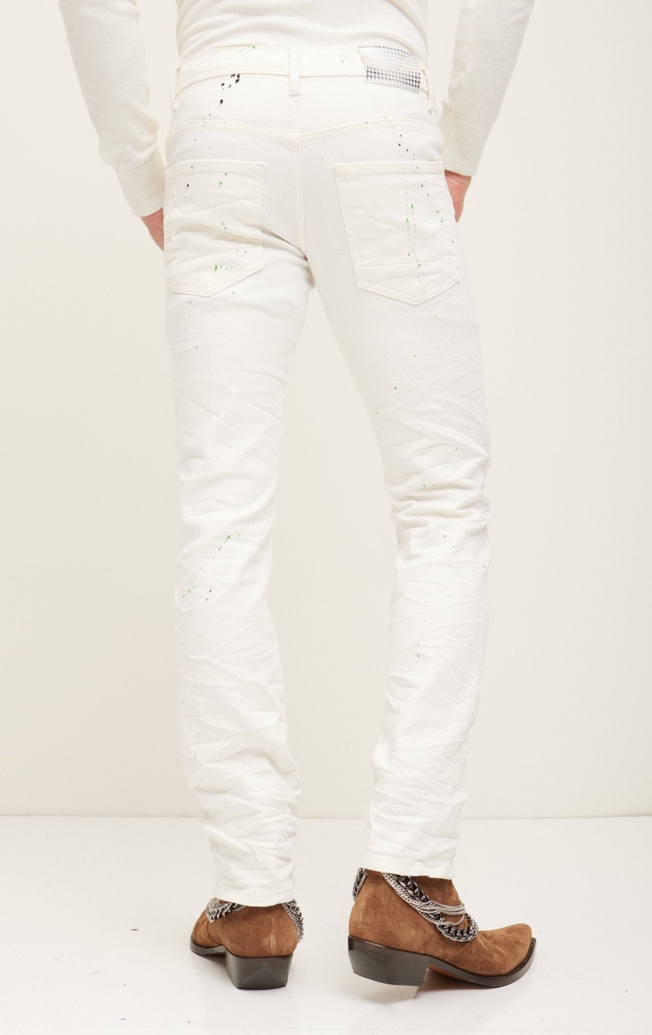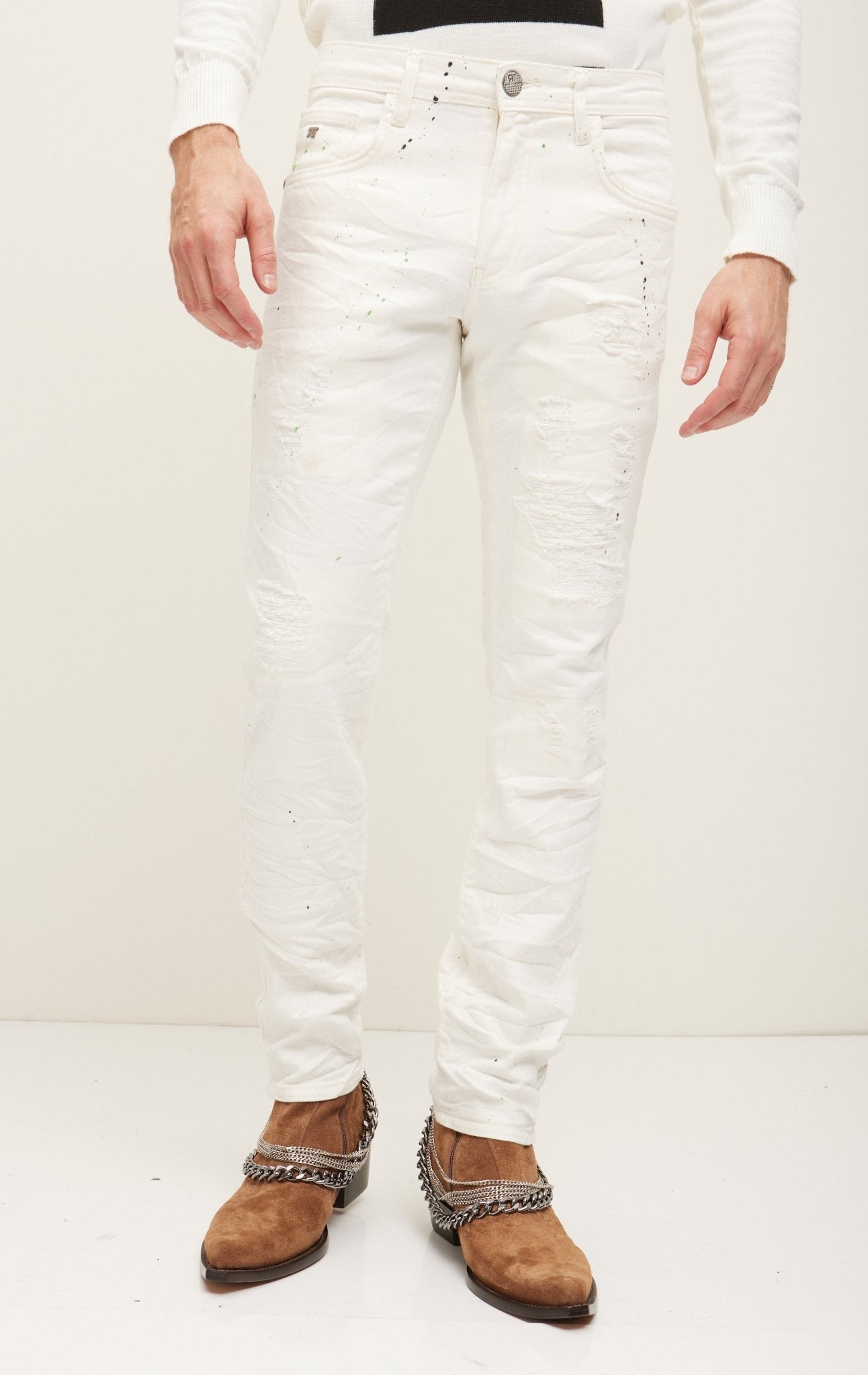 DETAILS You can never have too many classic staples. Tonal stitching compliments our classic soft cotton denim with subtle distressing and contrasting paint splatter. Featuring a five pocket design with metal hardware, a button fly, and slim tapered fit. SIZE + FITRegular fit, to find your correct size use the "what's my size" button. ...