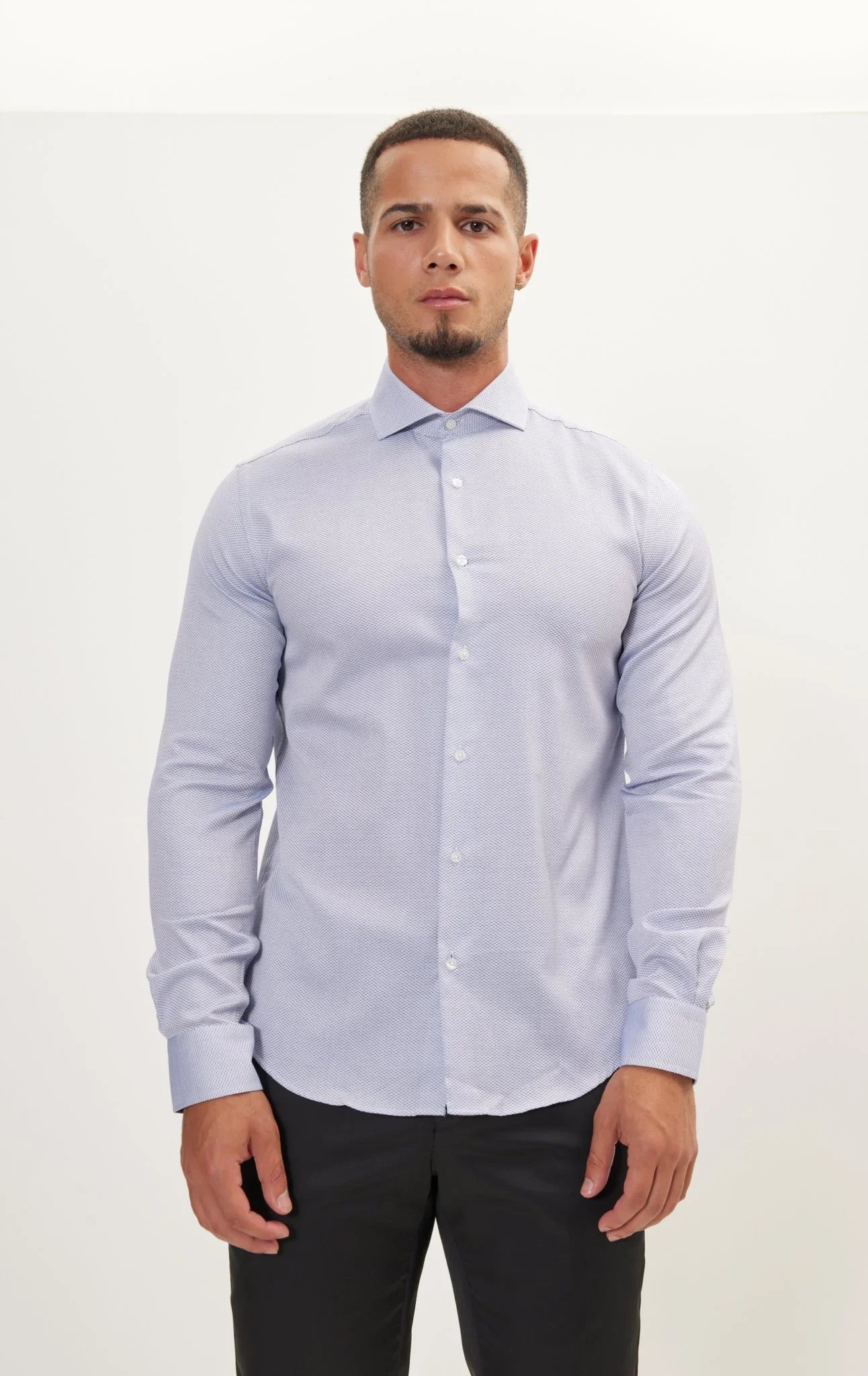 A superior twill single jersey cotton shirt with a super-smooth jacquard finish. Classic tailoring at its best. Our model JT is 6'2'' 40 Chest and he is wearing a Large size.
