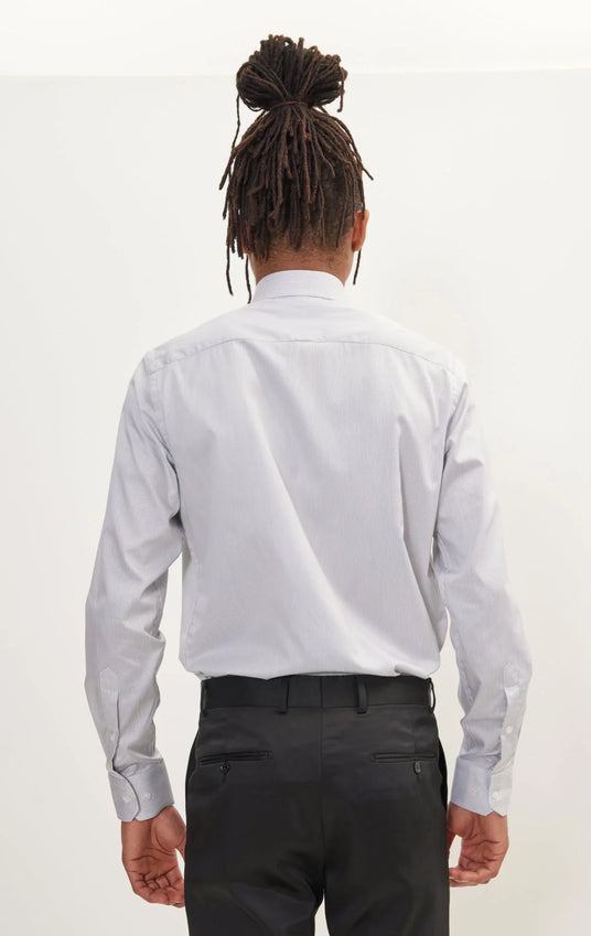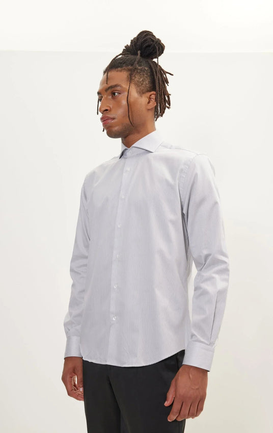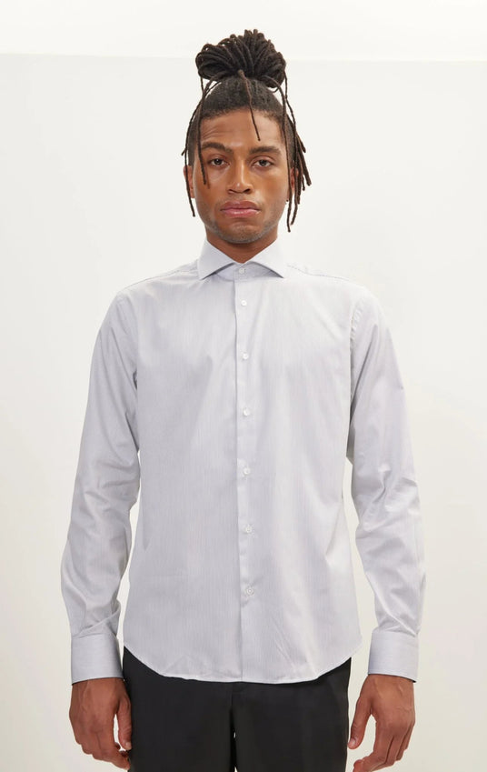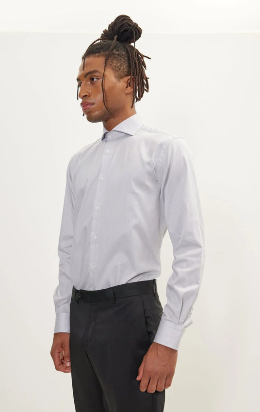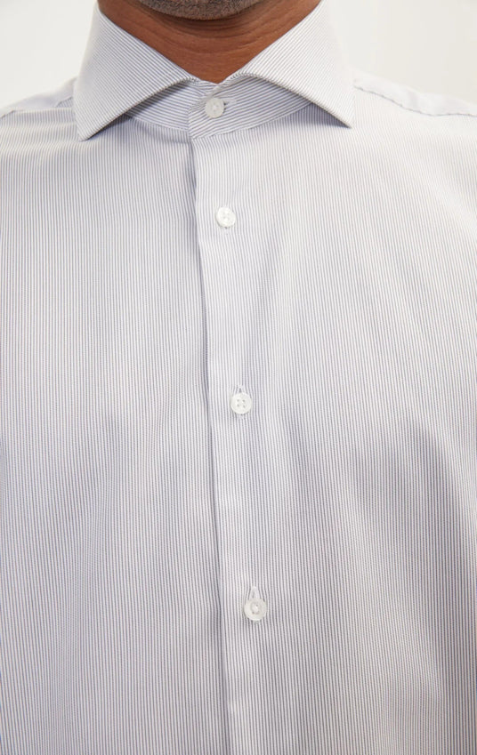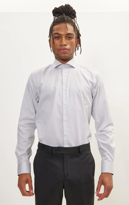Pure Cotton French Placket Spread Collar Dress Shirt - White Anthracite Striped