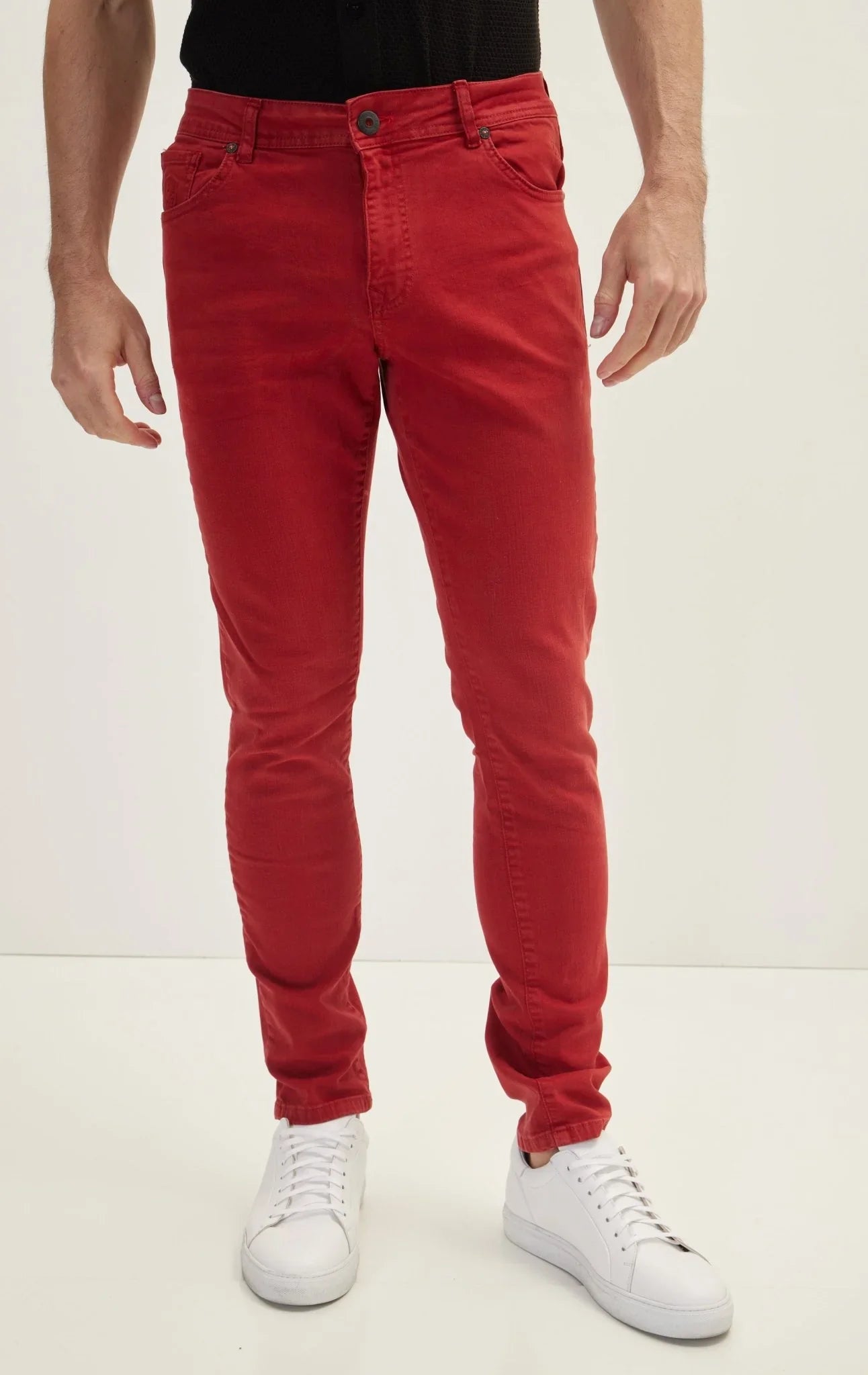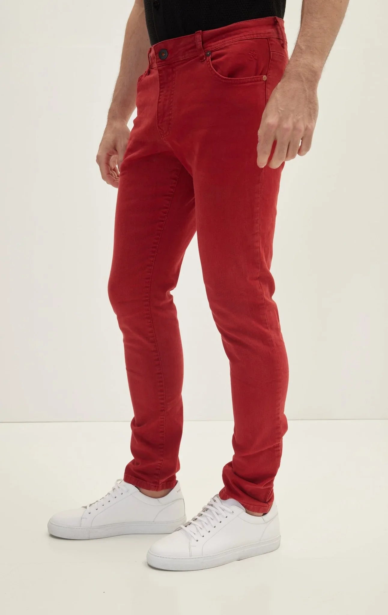 Light color slim straight denim with five pocket styling. Engraved logo detail on key pocket, zip fly, and single button closure